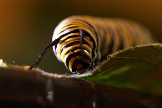 I turned back, and started to walk through the tall weeds, back to my car. The meadow was mainly made up of tall grass, canada goldenrod, daisies, and common milkweed. As I approached a patch of the common milkweed, I noticed something yellow on one of the plants. A 5th instar monarch caterpillar.